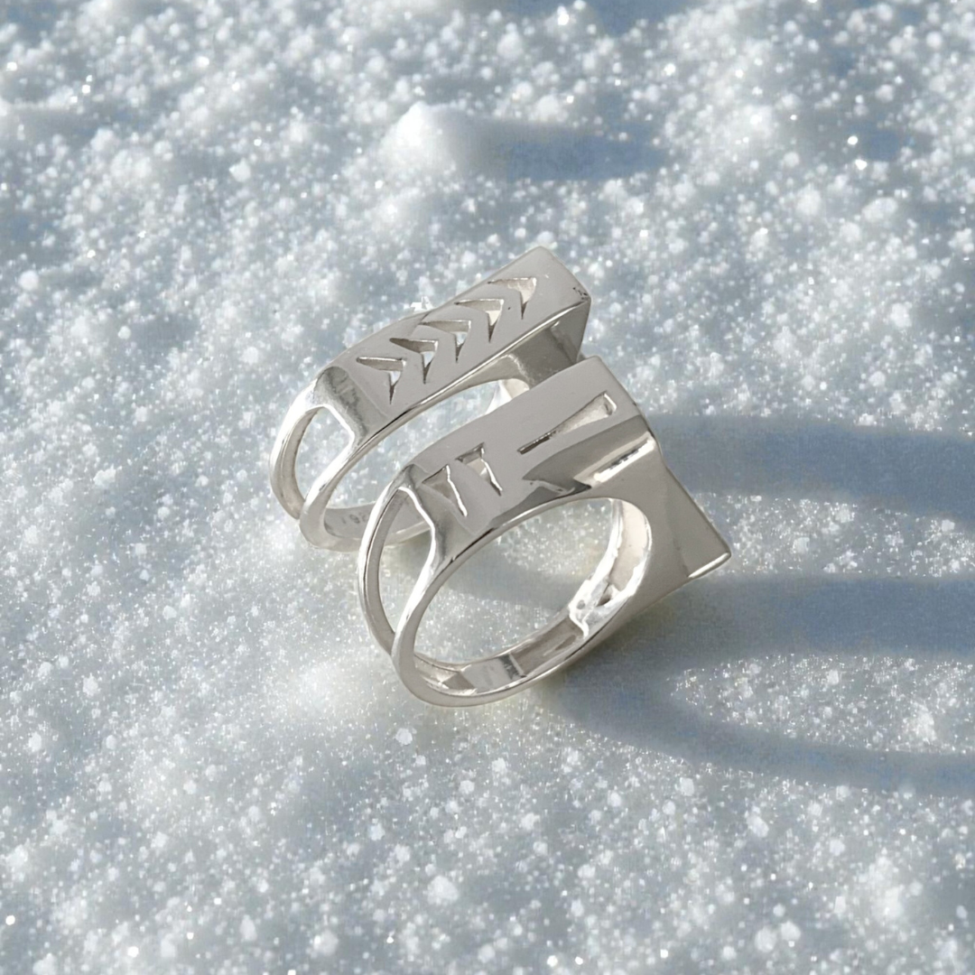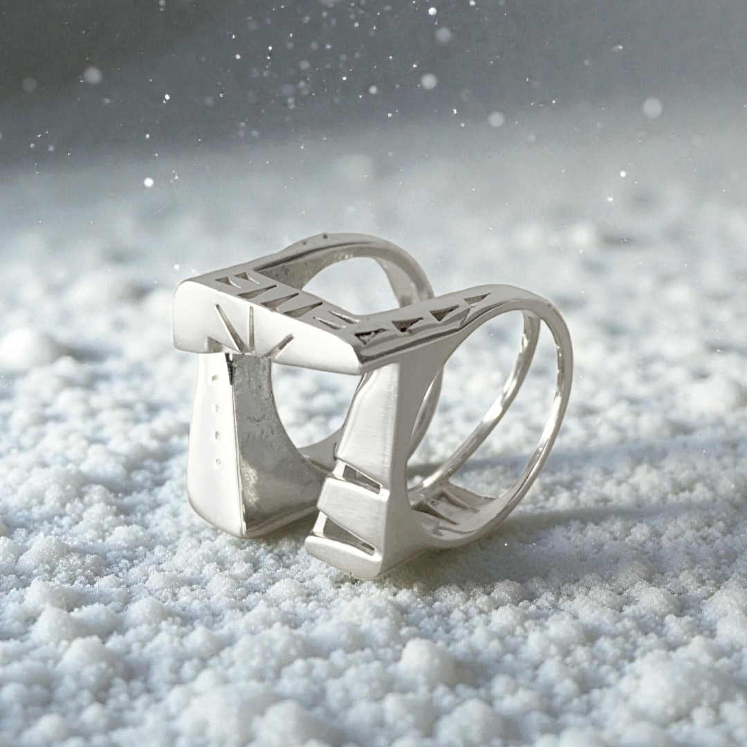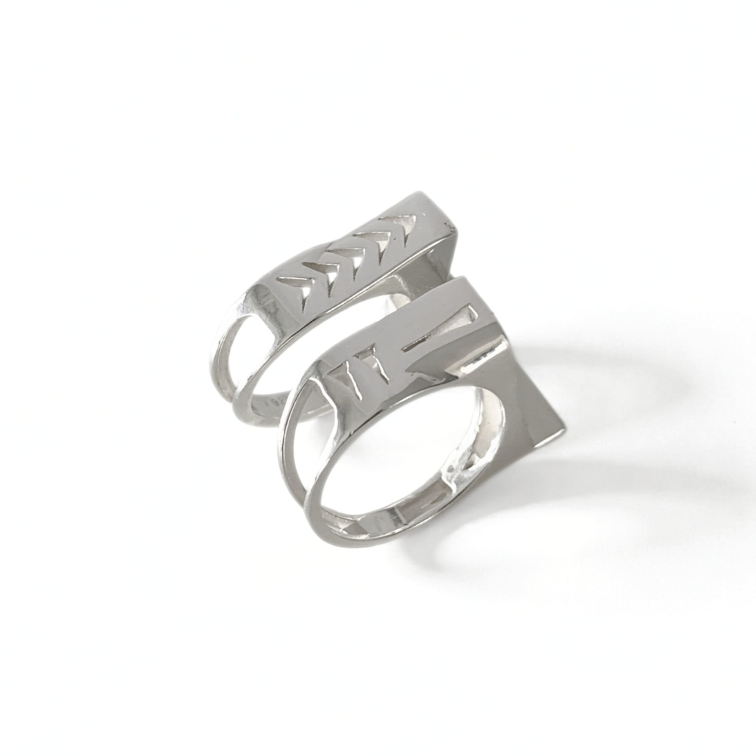 خاتم مُصمَّم بتقنية ثلاثية الأبعاد، يستلهم شكله من الحروف السومرية لكلمة “أمي”. يجمع بين عمق التاريخ وجرأة التصميم المعاصر، ليصبح قطعة تحمل معناها أكثر مما تحمل شكلها. في انحناءاته صدى قرونٍ مضت، وفي تفاصيله دفء البيت الذي بدأ منه كل شيء. إنه تذكار لمن يرتبطون بجذورهم بفخر، ويحملون حب أمهاتهم في القلب أينما ذهبوا.